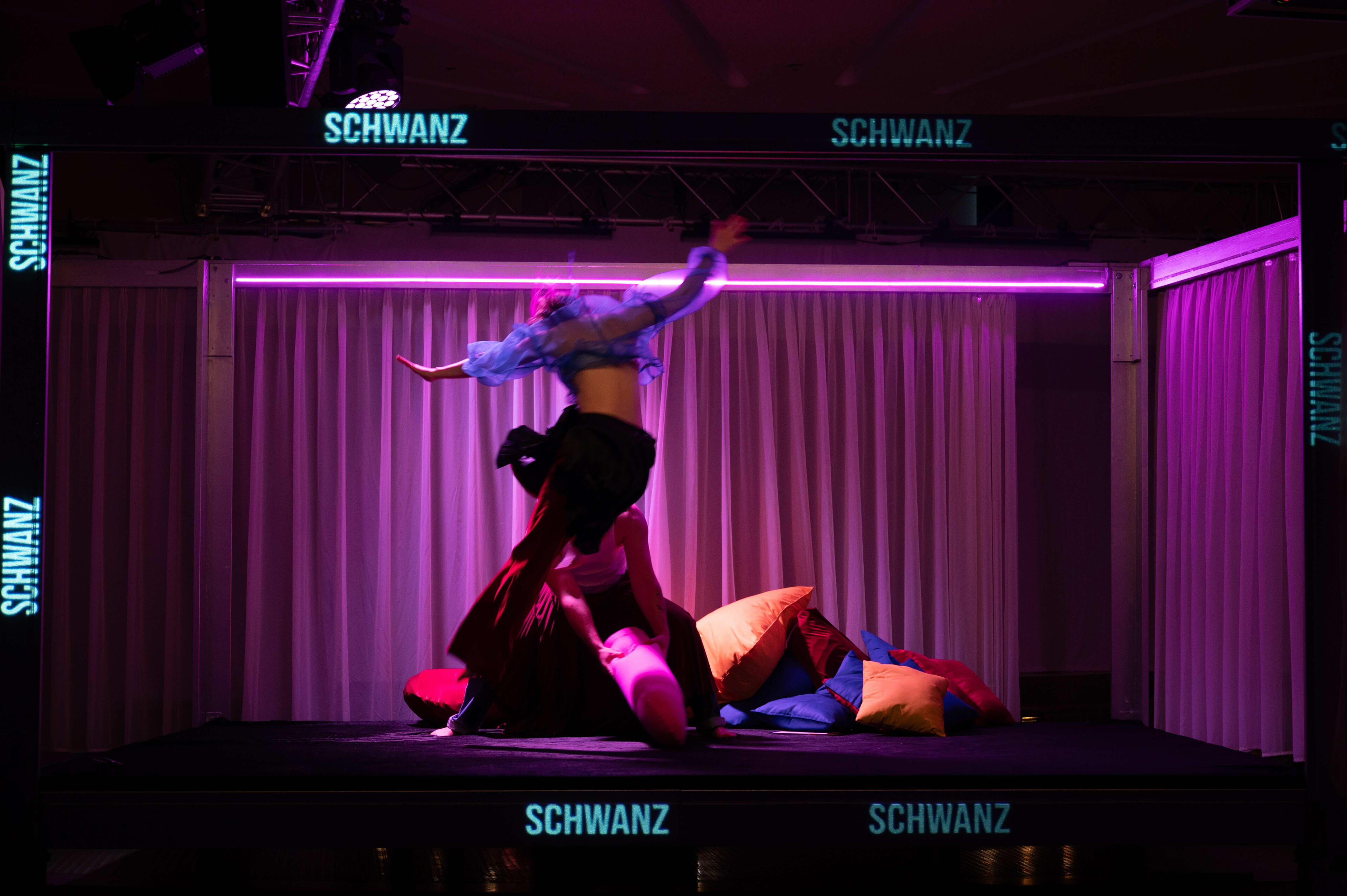 mit allem Drum und Dran, sprachlich, aber nur sprachlich, explizit wie die ganze Inszenierung.